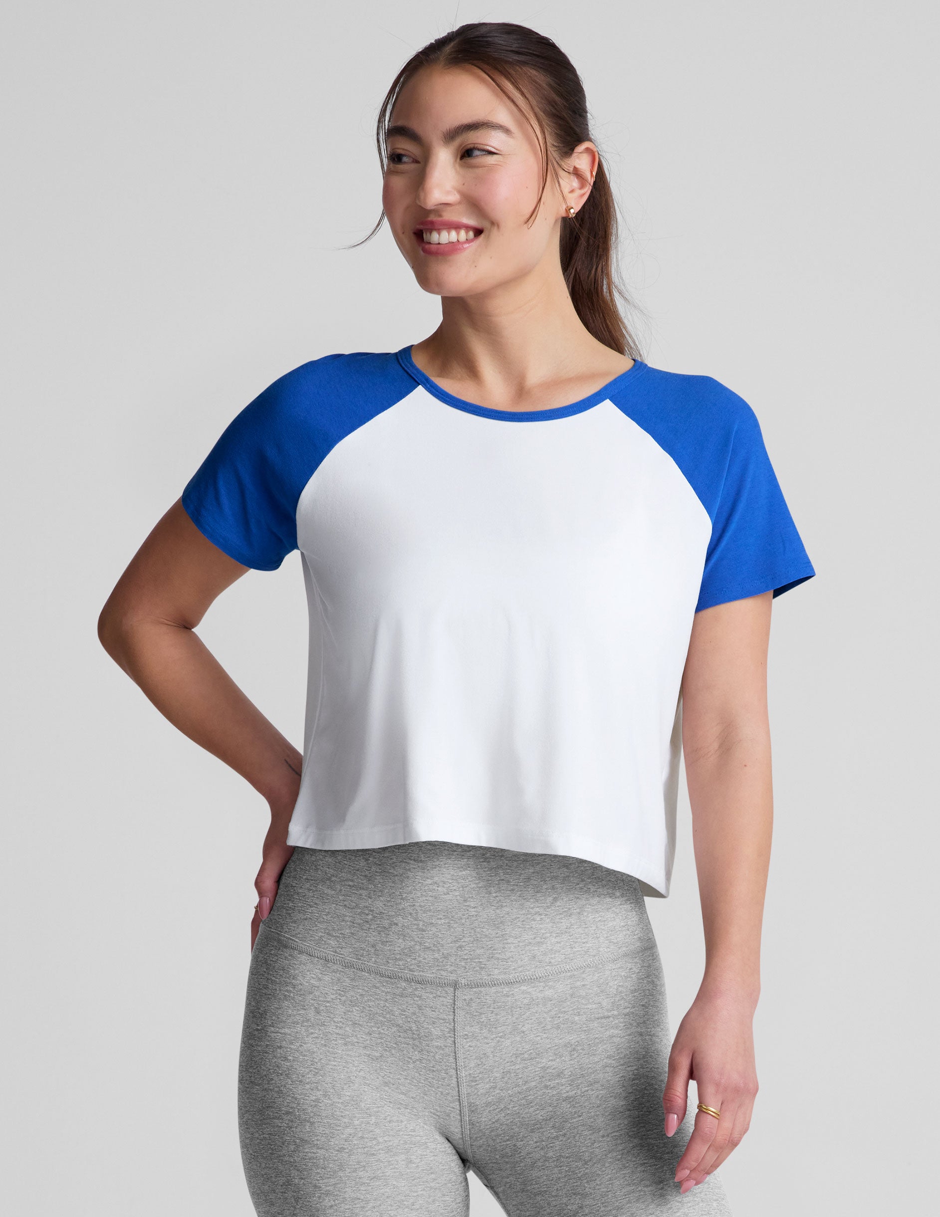 A throwback-inspired baseball tee with contrast sleeves. made of our softest. lightest fabric. Relaxed fit makes it a great choice even on hot days. with waist length for pairing with biker or denim shorts.