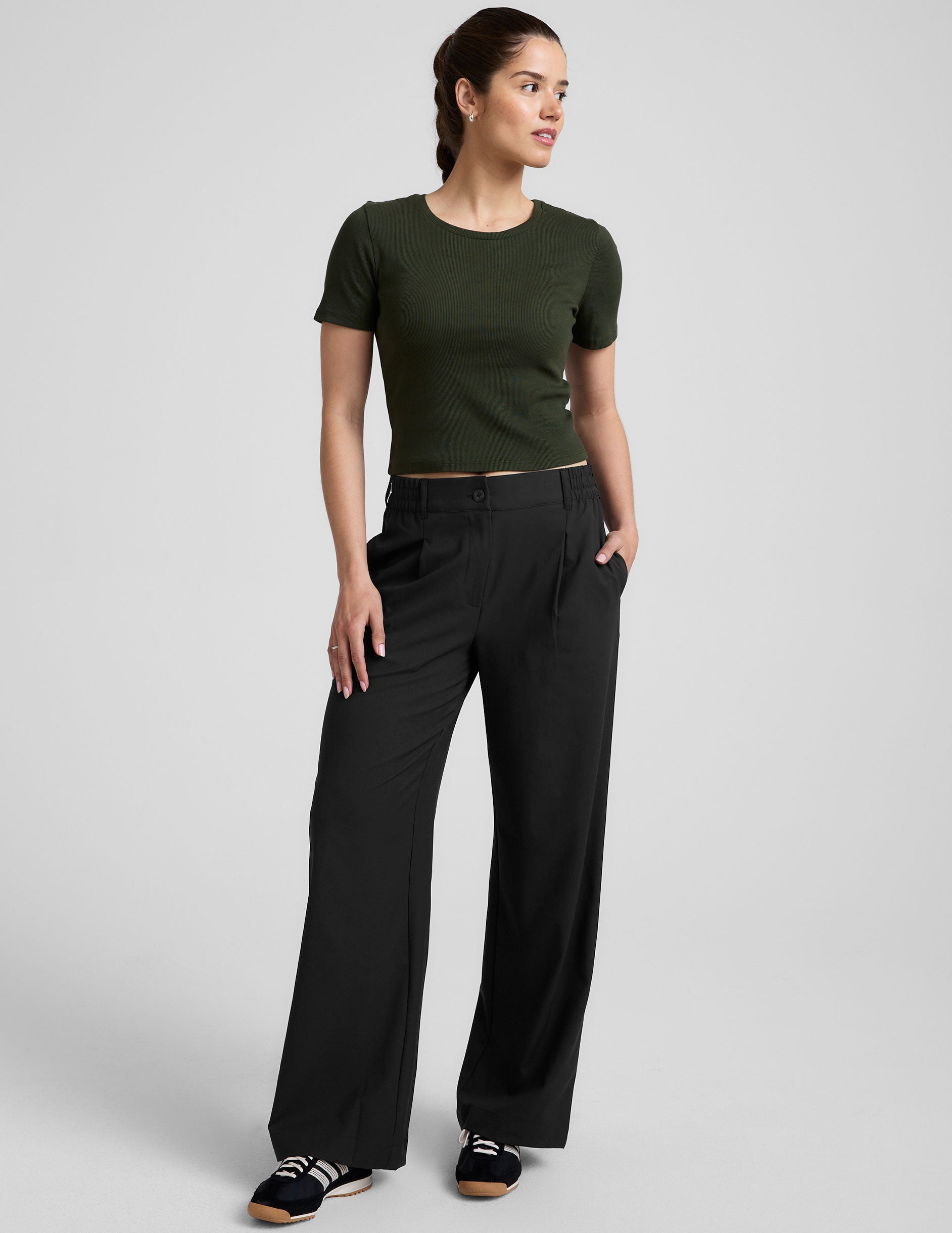 The ’90s called and they’re letting you keep this updated take on a baby tee. Made from our soft ribbed material. this cropped tee will be an instant layering piece in your wardrobe.